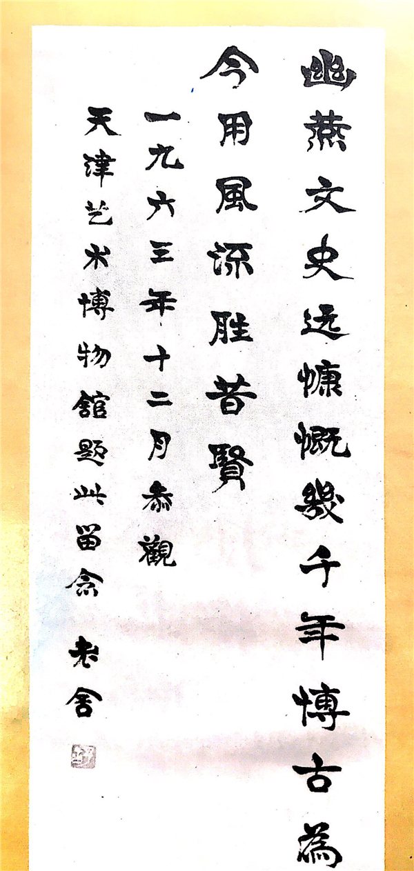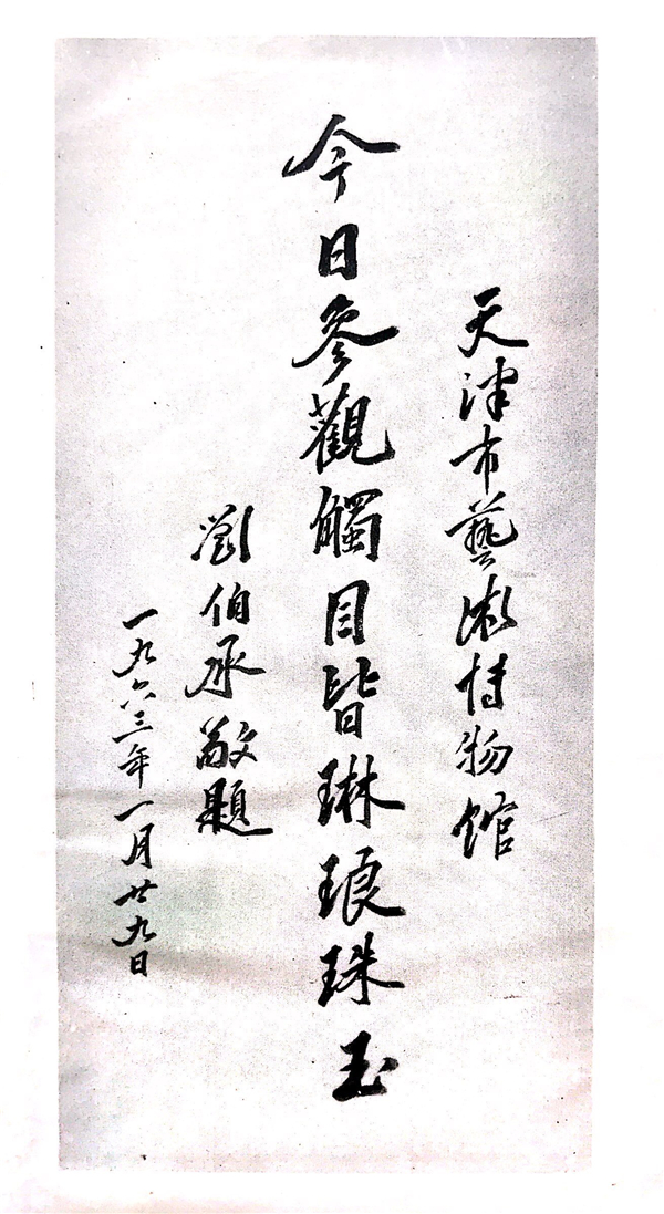天津市曾经有一座博物馆,盛名在外,吸引了各界名人前来参观、题字。1957年,中国科学院院长、著名历史学家、考古学家郭沫若专门为它题写馆名;1963年,刘伯承元帅前来参观并题字:“今日参观触目皆琳琅珠玉”。同年,著名作家老舍来馆参观、题词留念。这座博物馆就是天津博物馆的前身之一——天津市艺术博物馆。