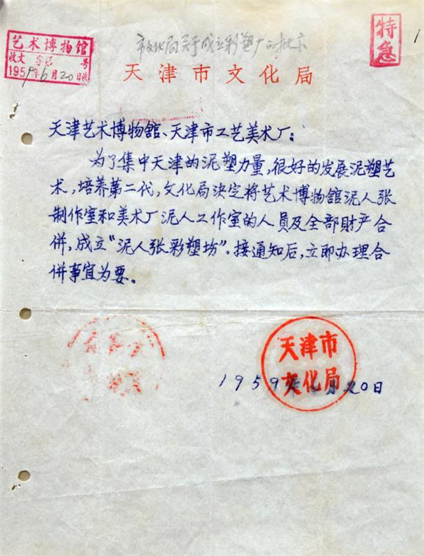 天津市文化局关于成立“天津市泥人张彩塑工作室”的文件