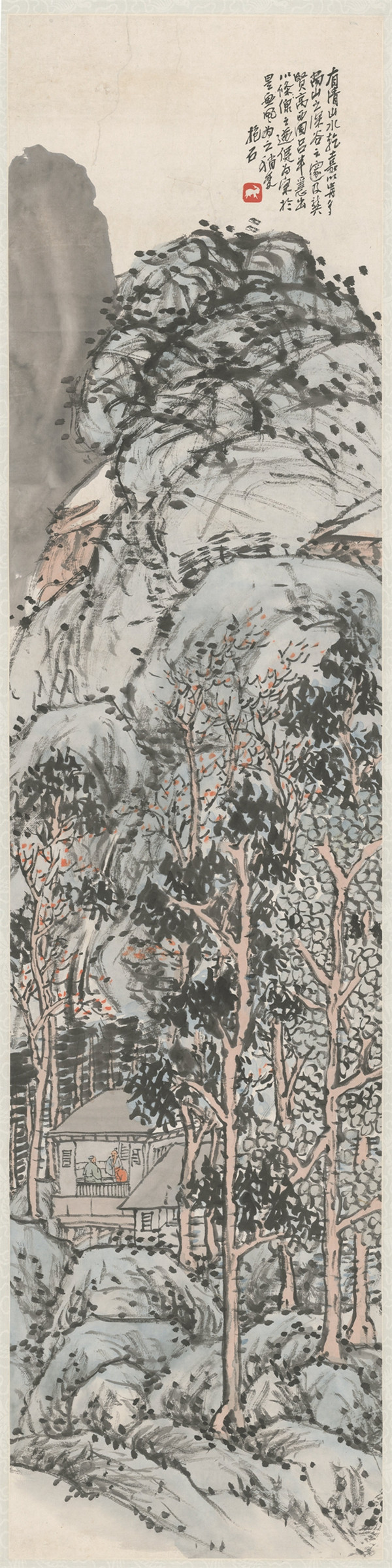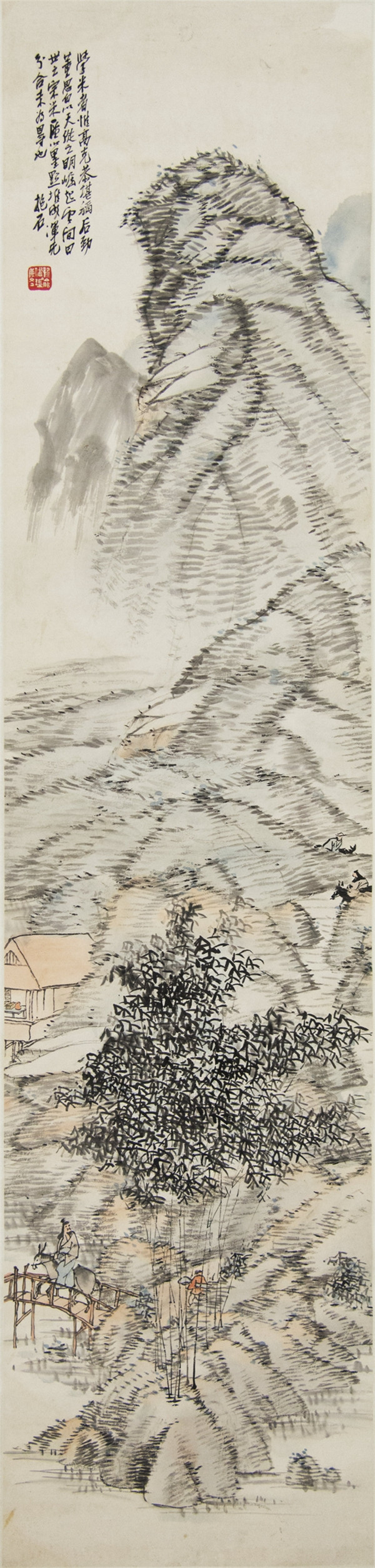 第一单元,“往往醉后”。“往往醉后”是傅抱石的一枚自刻闲章,以此表示其绘画“力求奔放生动,使笔与墨溶合、墨与色溶合,而使画面有一种雄浑的意味及飞扬之气势”。该单元重点展示傅抱石1940年代初期旅居重庆时的作品,这一时期,他的绘画风格开始从传统的“线”向“面”转变并迅速完成风格定型。几年间,他就地取材,驾轻就熟地演绎这种技法,惯用长锋山马笔,笔头、笔锋、笔根并用,结合山形、山脉的分坡走向,皴擦、勾斫、渲染并施,大胆落墨,细心收拾,使水、墨、彩在快速的用笔驾驭下有机地融为一体,淋漓酣畅,气象万千。
