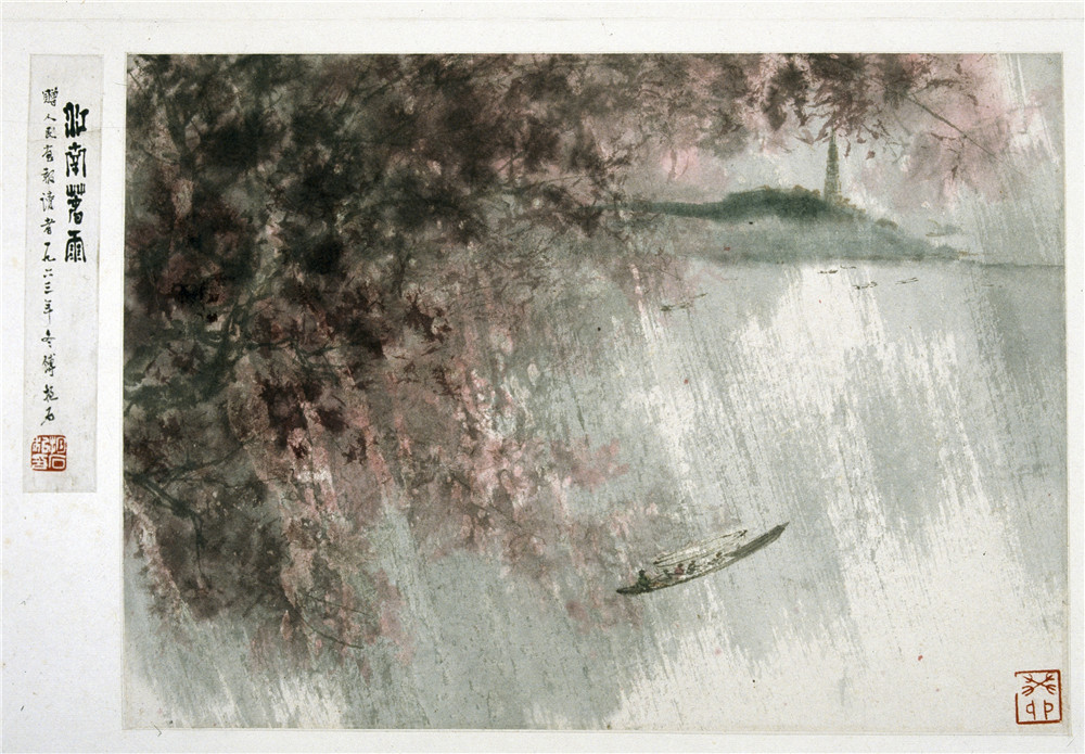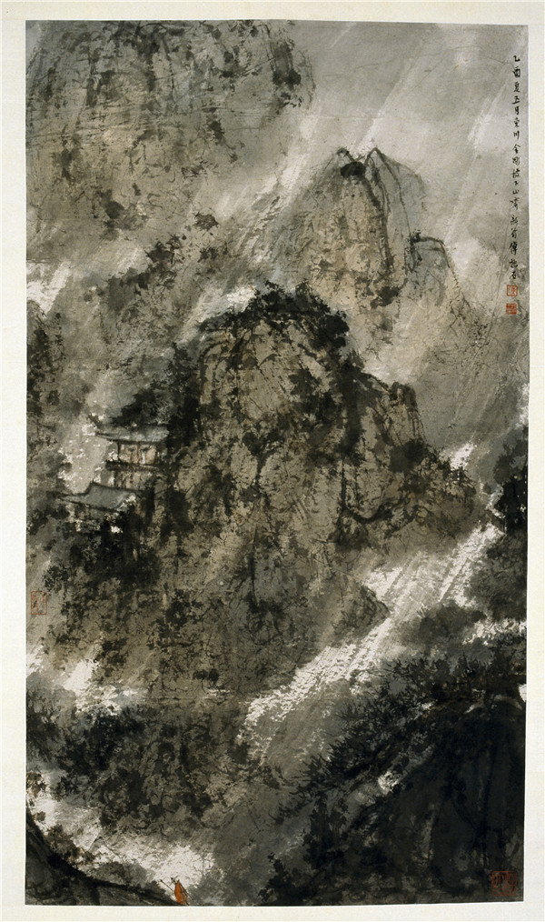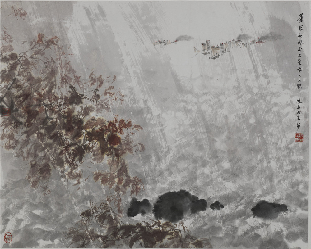 下面重点为观众介绍一下“抱石皴”。1939年4月,傅抱石来到重庆,住在沙坪坝金刚坡,在此勤于对中国画的研究和创作。千百年来,山水画的用笔大都是以中锋为主的勾、皴、斫、点,间以侧锋擦、染,傅抱石则突破传统笔法的约束,以散锋笔法作皴,用散锋乱笔表现山石的结构,创造出一种既源于传统,又富于新意的浑茫大气的“抱石皴”。这种皴法以气取势,磅礴多姿,自然天成,成为傅抱石“打破笔墨约束的第一法门”,也是傅抱石革新中国山水画技法的尝试。自此他进入艺术创作的一个高峰期。展览第一部分“往往醉后”中展出的《潇潇暮雨》就把“抱石皴”展现的淋漓尽致,把斜风细雨的景色渲染得无比美丽动人,充满诗意。