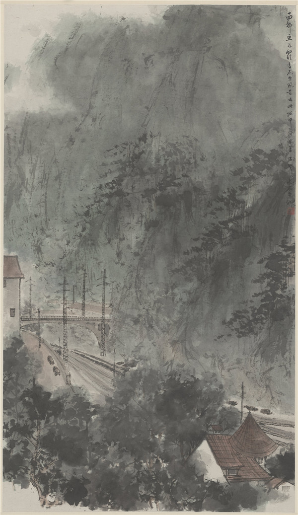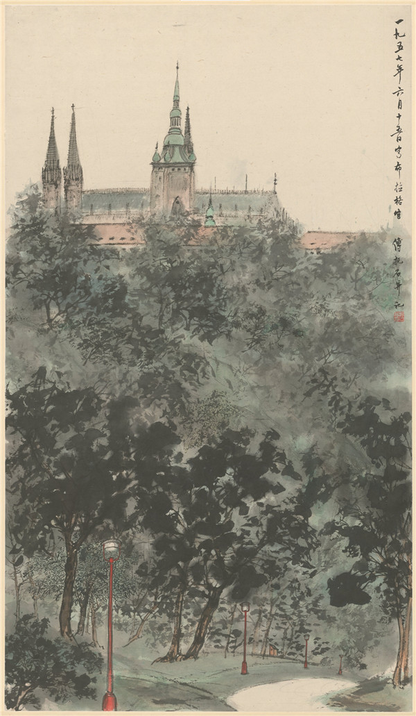 第三单元,“异域旅行”。展示的是傅抱石1957年5月至8月率中国美术家代表团出访捷克斯洛伐克、罗马尼亚等东欧国家的写生作品,这是他第一次真正以写生方法集中创作,也成为其绘画创作的转折点。他在着重写实表现时融入“西画因素”,构造出开阔的物理空间,完成了自然景物形与神、光与影、色与墨、虚与实、质与文的高度融合,面目为之一新。展览中的《TATRY山最高峰图》《布拉格宫》《西那亚城中俯瞰车站图》等都表现了傅抱石写生初期从摸索至适应再至完善的渐进过程,呈现了“所见即所得”的视角体验,也昭示了他20世纪50年代山水画创作变革的到来。