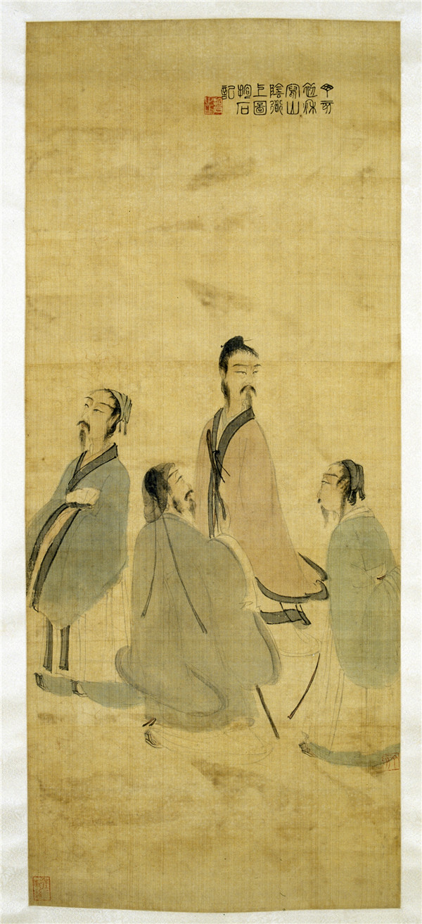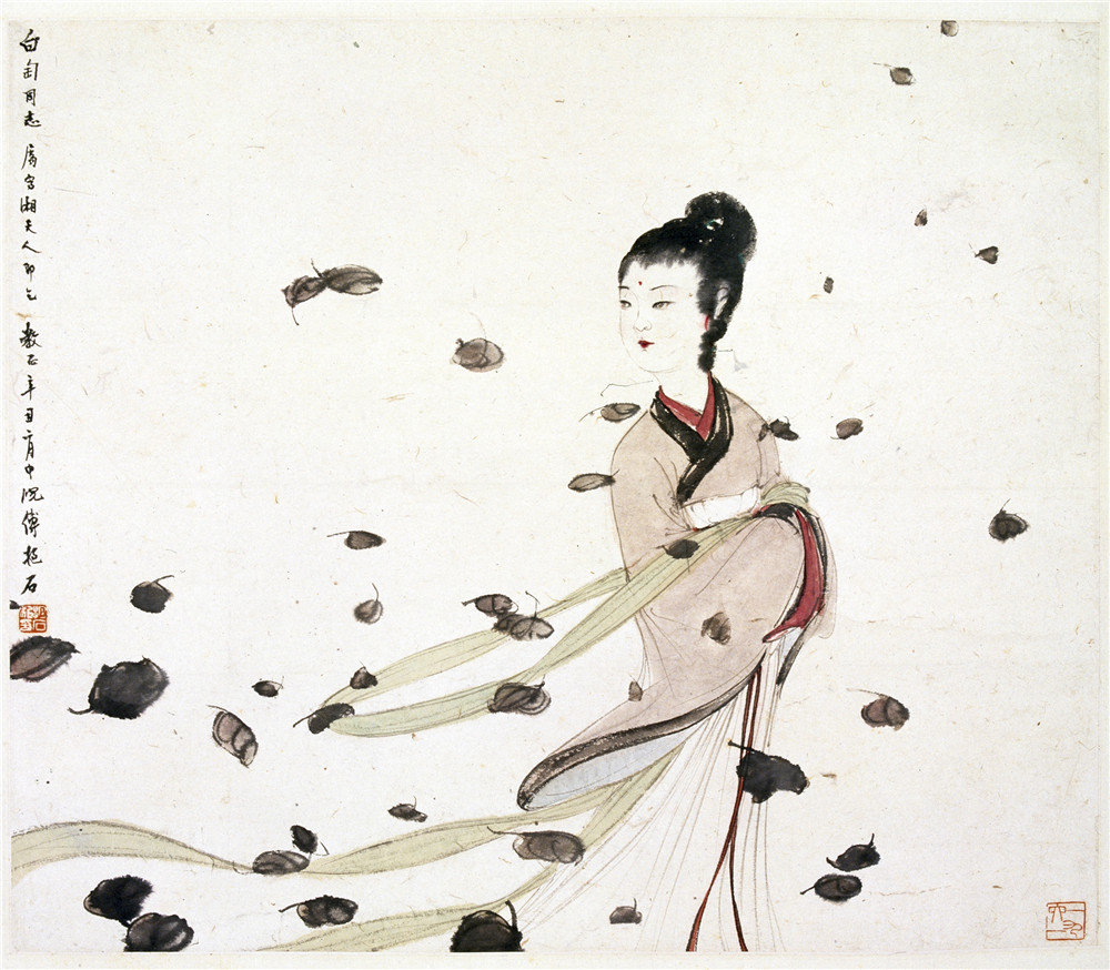 第二单元,“上古衣冠”。重点展示傅抱石传统历史人物画的创作。与其山水画创作较为注重块面、相对弱化线条相反,傅抱石在人物画中则一如既往地追求“线性”,用笔速度极快且富有弹性,融合破笔散锋,自成一格。他所绘人物或高人逸士,仙风道骨,气宇轩昂,或靓女美妇,面容光洁,妩媚艳丽,充分展现出高贵博雅的古朴气质,但又不失现代的浪漫气息。同时,他更善于将自己与人物类似的情感融入其中,通过形象构思将奔放的创作冲动表现为想象的驰骋,十分注重气氛的烘托、意境的营造,能将难以言传的微妙气息准确地表现出来,细腻地再现历史人物的精神气质。
