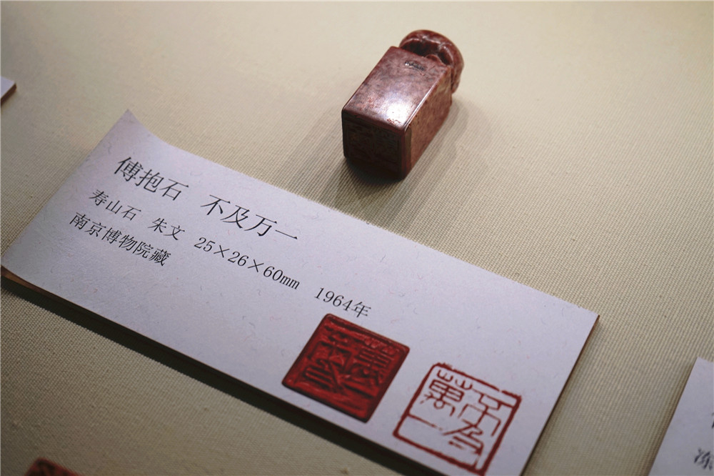 傅抱石一生治印达3000余枚,与其绘画创作的数量不相上下。他最初踏入艺术之门时,正是从篆刻入手。傅抱石幼年自学篆刻,无师自通,到十几岁时仿赵之谦已达乱真境地。1926年,傅抱石二十二岁时,编写《摹印学》,对篆刻历史和理论做出初步讨论,并将多年来的治印体会融汇其中。1933年,其二十九岁时,辑历年所刻印章编成《抱石自造印稿》,1937年33岁时又出版《傅抱石刻印概论》等多部印学理论专著。傅抱石的篆刻作品自然率真、端凝浑穆、宽博峻拔、茂密疏朗、雄秀古雅、敛放自如,在篆刻艺术中创造出自成一体的精神风貌和风格特色。