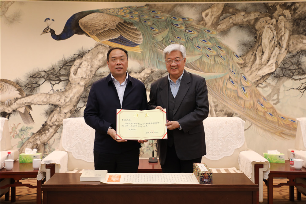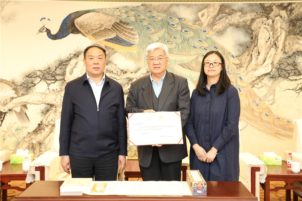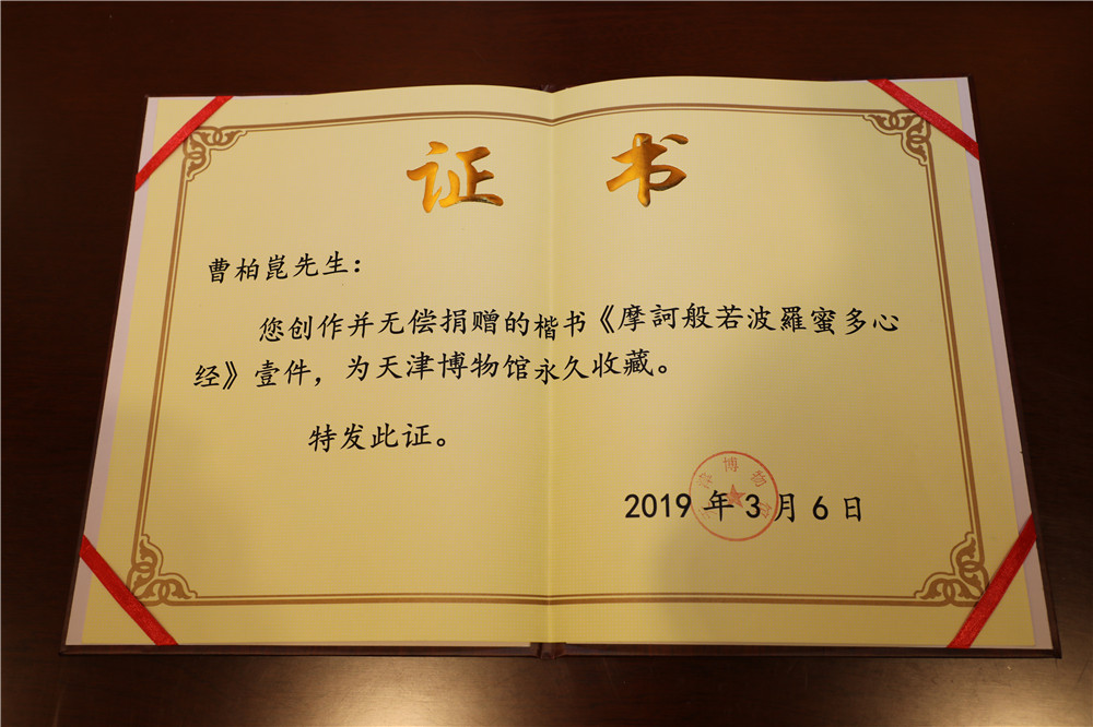 为纪念恩师刘光启先生,2019年3月6日,天津著名书法家曹柏崑先生将自己精心创作的楷书作品《摩诃般若波罗蜜多心经》捐赠我馆。馆长陈卓、副馆长钱玲出席捐赠仪式。曹柏崑,国家一级美术师,著名书法家,师承已故文物鉴定大家刘光启先生,历任中国书法家协会理事、天津书法家协会副主席等职,书法作品连续入选全国书法展,并在日本、新加坡等多地展出。