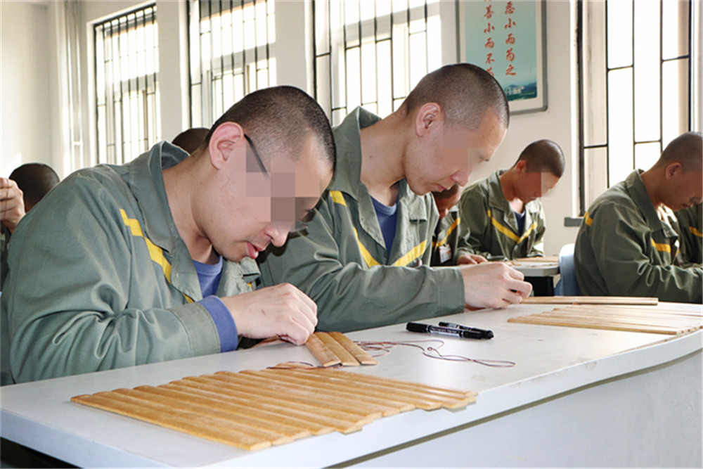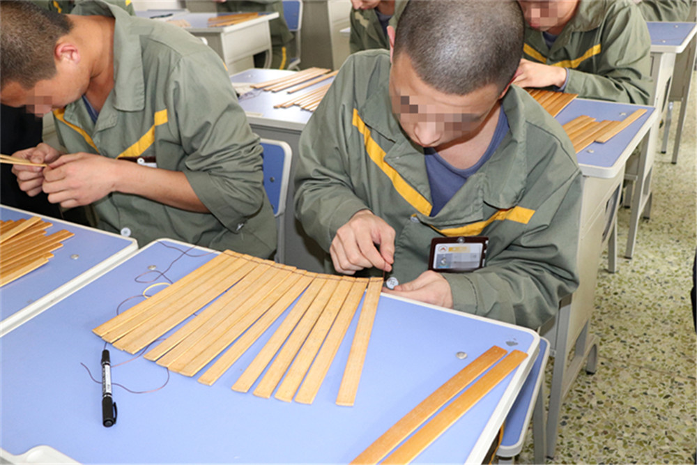 服刑人员铺平竹简,手拿线绳,全身心地投入到了竹简的串编过程中……