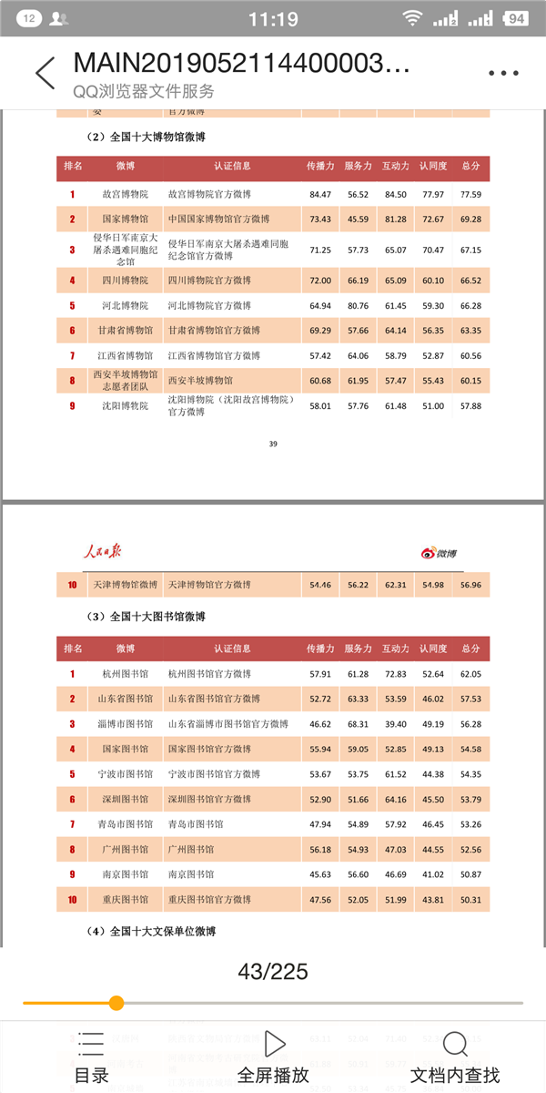 日前,人民日报发布《2019年第一季度人民日报·政务指数微博影响力报告》,共公布了中央机构、财政、公安、文旅等50大类微博账号影响力指数,天津市共有13个政务微博上榜,其中天津博物馆官方微博入选“全国十大博物馆微博”。