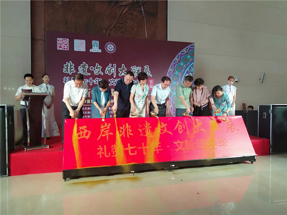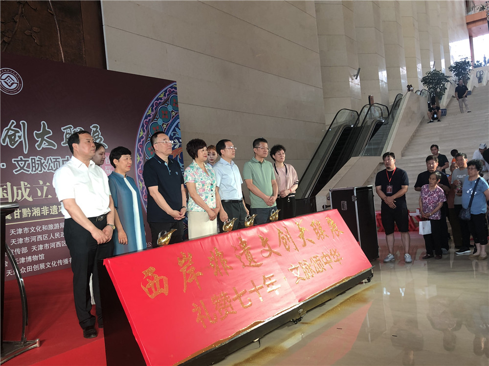 7月9日,礼赞七十年·文脉颂中华--西岸·2019首届京津冀甘黔湘非遗项目及文创产品大联展开幕式在天津博物馆举行。天津市文化和旅游局副局长游庆波,天津市河西区委常委、宣传部长杨志庆,天津市河西区人大常委会副主任孟华,天津市河西区副区长李丽君,天津市河西区政协副主席刘庆荣,天津博物馆党委书记、馆长陈卓,天津市河西区文化和旅游局局长宋杨,天津市非遗保护协会会长李治邦出席了本次开幕式。开幕式由天津博物馆副馆长王昆主持。