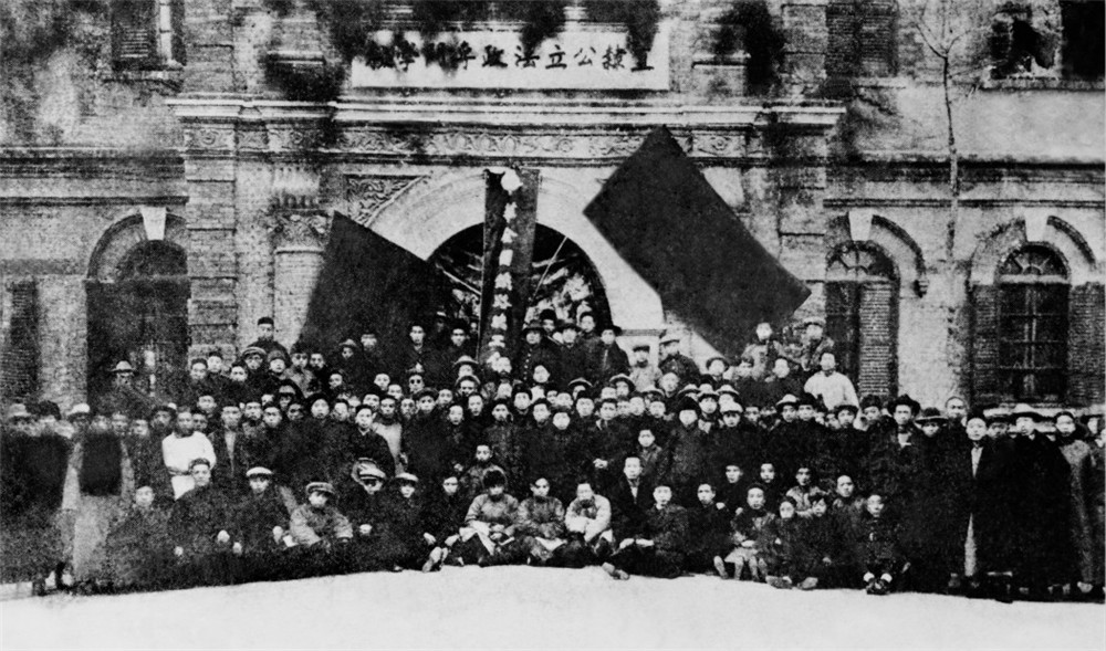 1926年2月7日至16日,中华全国铁路总工会第三次代表大会在天津召开。开幕式在南市第一舞台举行,正式会议在国民饭店(今和平路国民饭店)召开。这是中国共产党领导的革命团体在天津召开的首次全国性会议。图为与会代表在直隶公立法政专门学校门前合影。