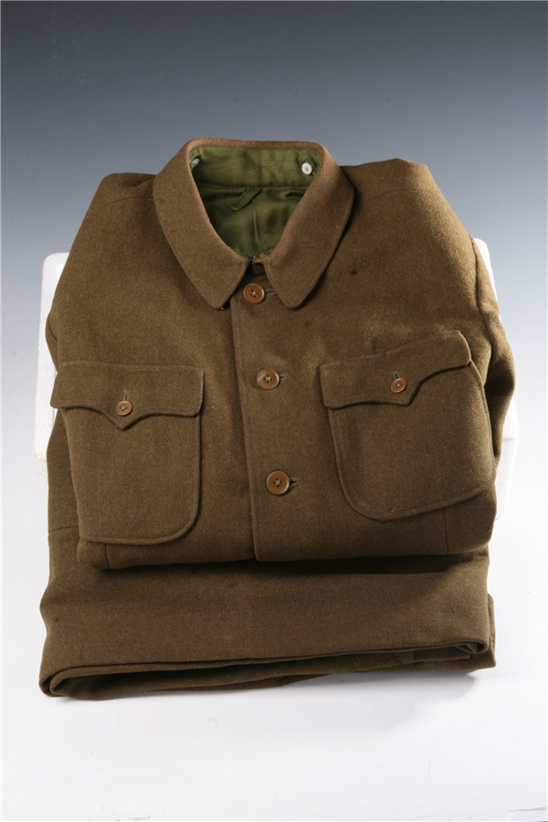 1949年10月1日下午3时,中华人民共和国举行开国大典,毛泽东在北京天安门城楼上宣告中华人民共和国、中央人民政府成立了。从此,中国结束了一百多年来被侵略、被奴役的屈辱历史,真正成为独立自主的国家。图为毛泽东主席在开国大典上穿过的绿呢制服。此制服材料为前苏联进口呢子,上衣为四口袋制服,下衣是制服裤,为了开国大典,特意为主席定做的。此后主席还经常穿这套制服接见外宾,及出外视察。直到1954年改换灰色制服后,他才把此套制服赠送给他的卫士长李银桥同志,后经李银桥改制。1976年9月9日,主席逝世后,李银桥将此套制服捐赠给天津博物馆,作为革命文物保存。