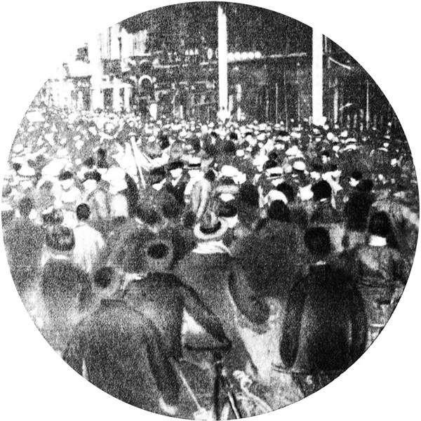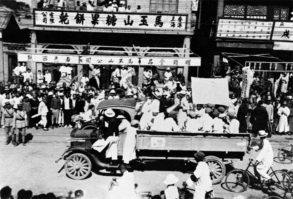1925年5月30日,帝国主义在上海制造了震惊中外的五卅惨案,激起天津人民的极大愤怒,掀起了反帝爱国热潮。6月10日,在中共天津地委的组织领导下,天津各界联合会宣告成立,中共天津地委妇女部部长邓颖超当选为主席团主席。图为各界联合会宣传队乘车在东马路演讲,散发传单。