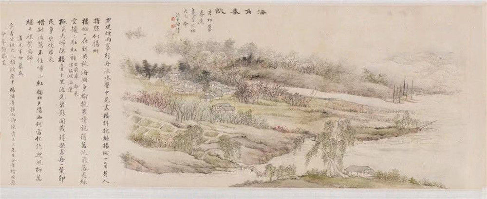 此卷分三段。依次为孙雨卿绘“春帆柳色”、陈靖绘“海角春帆”、杨天壁绘“津门柳色”。画于道光十一年(1831年)。画后分别有郭汝骢(小陶)、陈成栋、徐杨绪、松年等题跋。画、跋均应凫香(陶梁)大人命而作。此卷画面银塘万顷,柳碧桃绯,万树千帆,再现了水西庄暮春时节的优美景色。不愧为“有人指点似扬州”。
