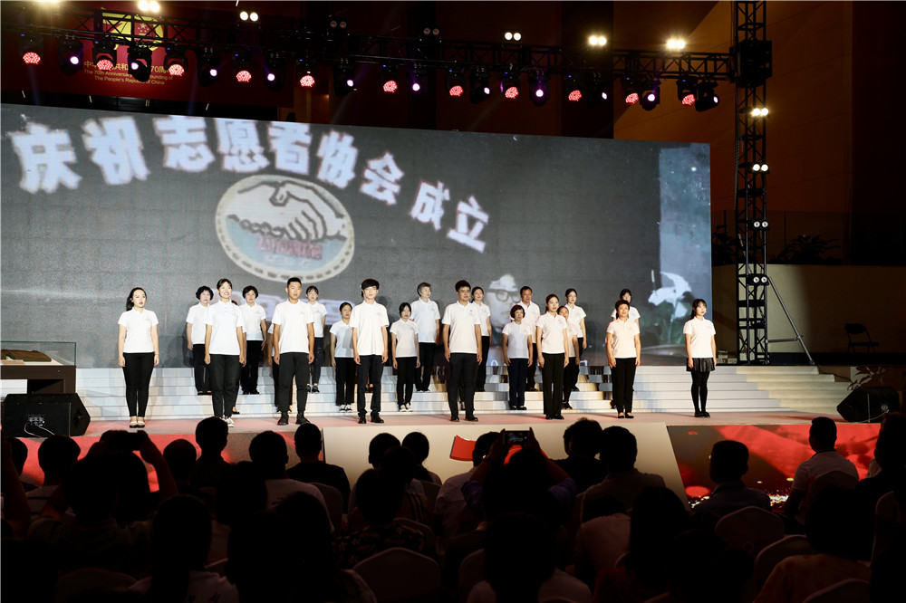 志愿者展示作为展演的一个重要环节备受现场观众喜爱。已从事志愿服务45年的第七届“全国道德模范”提名奖获得者王辅成、一年累计服务24817小时的“全国十佳志愿者服务团队”——天津博物馆志愿者团队登上舞台,台下便响起雷鸣般的掌声。大家用铿锵有力的声音宣誓:让我们以坚守的名义,向新中国成立70周年致敬!