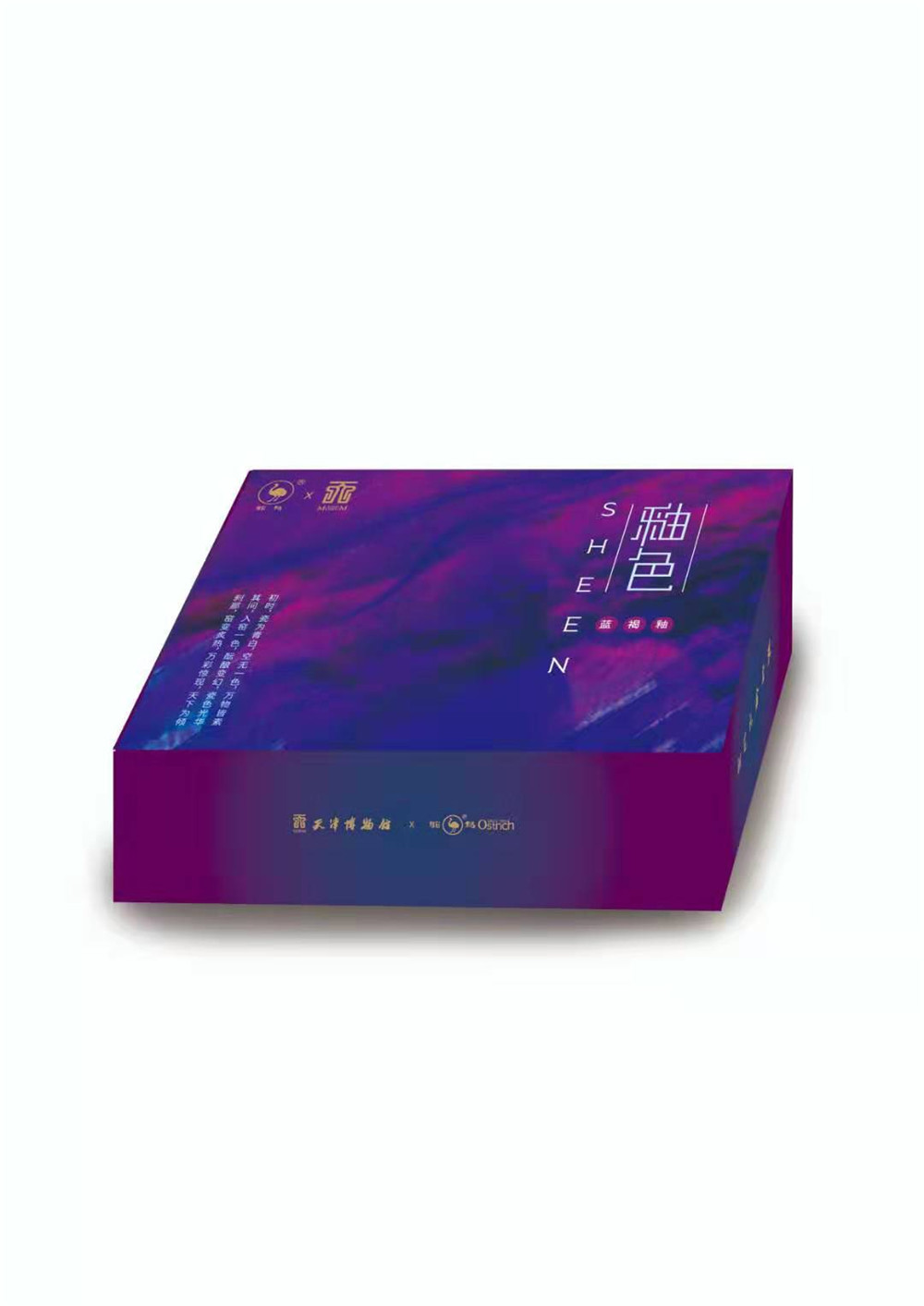 【窑变色SHEEN墨水】“鸵鸟”文创工作室提取天津市博物馆馆藏珍品窑变瓷器核心要素,牢牢抓住由于窑温发生变化导致釉面颜色的不确定自然变化这一特点,使用新型原料经过反复实验,运用国际先进技术打造了一款自然渐变窑变色SHEEN墨水,在墨水领域独领风骚,颜色变化多样,在不同角度不同力度下能够呈现出独特的效果。