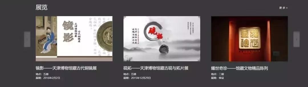 如在微信公众号“天博播报”推出“天博约会博物馆──云·看展”活动,网友们便可在“云·看展”中欣赏到了《耀世奇珍──馆藏文物精品陈列》等常设展览,同时推出了专题展览的线上展示,包括《聚赏珍玉──馆藏古代玉器陈列展》《砚拓──馆藏古砚与拓片展》《青蓝雅静──馆藏青花瓷器陈列展》《镜影──馆藏古代铜镜展》《智启津沽──严修与天津近代文化教育展览》等。