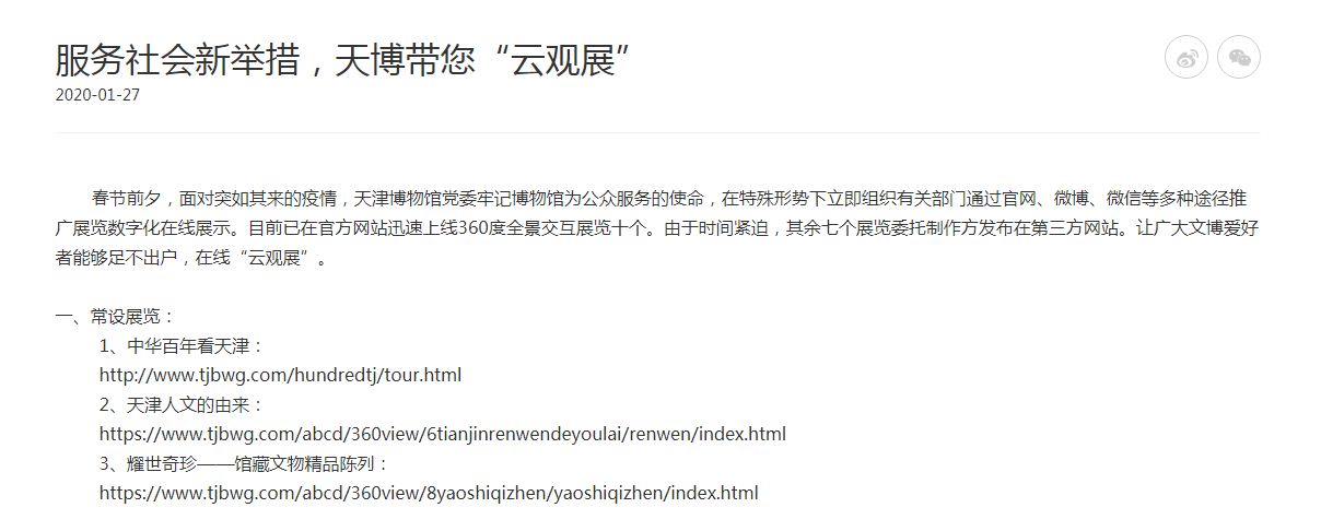 闭馆期间,天津博物馆积极利用自身网络资源开设网络云展览,确保疫情防控期间文化服务不断档,向社会公众提供安全便捷的服务。日前,我馆官方网站、官方微博、微信公众号、今日头条号均已陆续推出“云看展“系列网络展览,广大网友足不出户便可享受天博提供的文化服务,欢迎广大网友一起“云观展”。