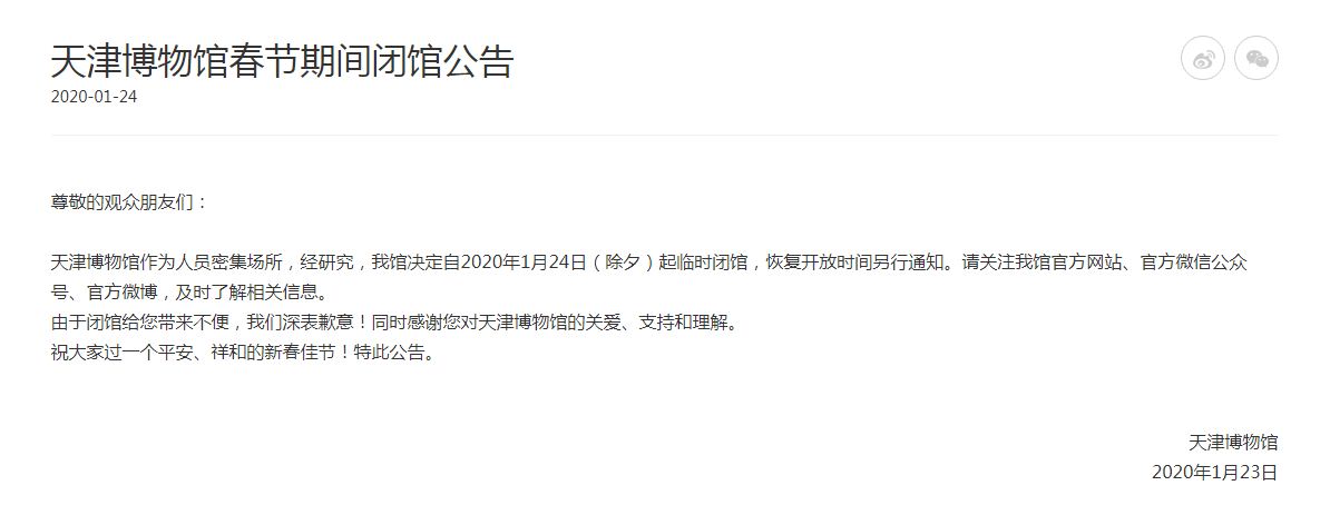 得知新型冠状病毒感染的肺炎疫情后,天津博物馆积极响应市委市政府、文化和旅游局以及国家文物局提出的部署要求,将广大观众的生命安全摆在首位,1月24日起紧急闭馆,原定的文化活动全部取消,最大限度避免了人群在场馆内聚集,得到社会各界一致认可与理解。