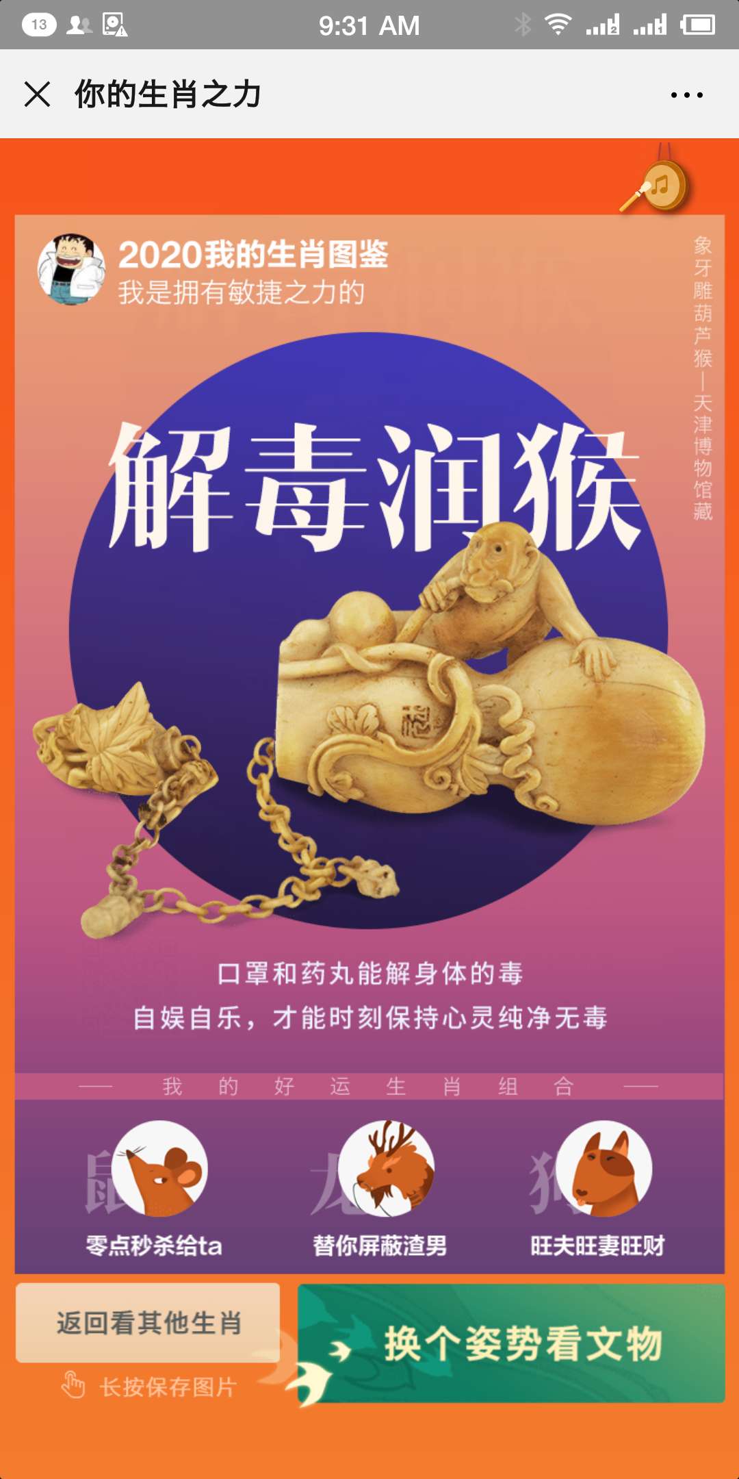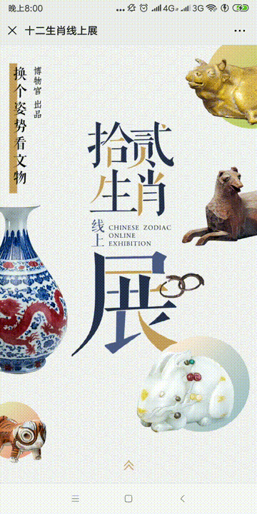 本次线上展览的文物都与十二生肖有关,使用文物带出传统生肖的文化内涵与知识普及,并为每个生肖文物赋予生命力(如鼠聪慧、虎霸气、龙活力等),并与线上网友用户发生关联,每个人都蕴藏着的非凡的「生肖之力」。通过网友用户匹配的生肖文物的正能量内容,并与好友的玩法关联,一起为2020破局。