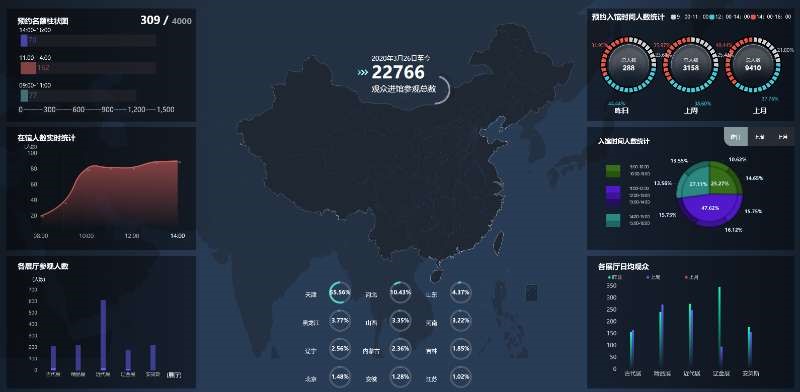 同时,图像信息部经过反复调研论证,将大数据技术着力应用在提高服务质量,提升观众的观展体验上。国际博物馆日前夕,天津博物馆大数据平台上线了第一个功能界面,结合疫情期间的特殊性,将恢复开馆以来的观众历史数据进行梳理,体现出在不同阶段,全国各地参观者到馆参观的比例变化。平台还可以反应出馆内观众的实时情况,当客流出现密集的情况会实时提出警示。此次上线的大数据平台仅为观众数据的分析展示界面,后续还会增加藏品和展览、基础设施、宣教活动、文创商品等数据的分析展示。力求通过这一平台,收集整理更加全面的数据加以统计分析,从而提升天津博物馆对观众的服务品质。