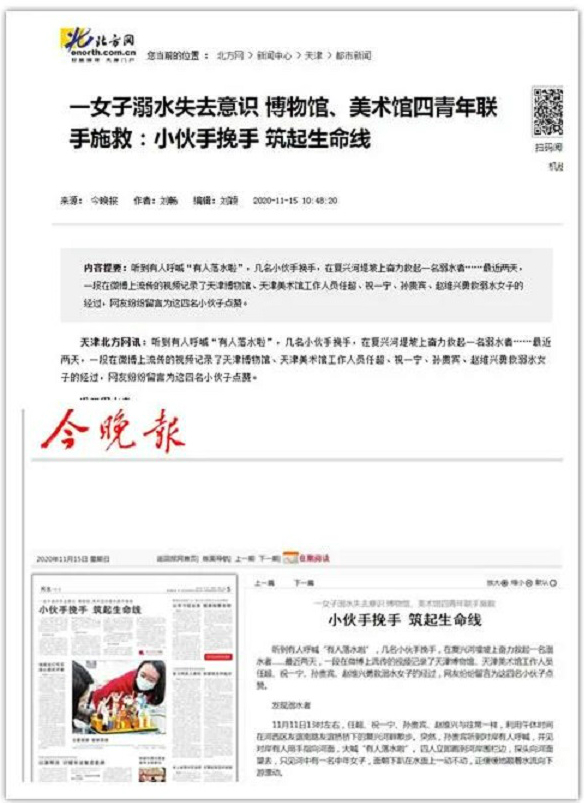 11月17日,一个“天津小伙们救人的样子真帅”的视频发布在了“学习强国”APP上,引发了热烈讨论,大家纷纷为小伙们的勇敢点赞。在万分紧急的情况下,天博四位小伙子挺身而出,合力将命垂一线的落水者施救上岸后便悄然离开现场。然而,这座城市不会遗忘这些无名英雄。天津电视台、今晚报等众多媒体争先报道,让更多人了解了这几位满满正能量的小伙子。