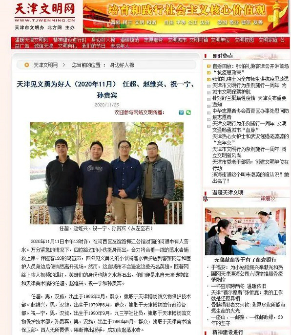 11月25日,天津博物馆任超、赵维兴、祝一宁以及天津美术馆孙贵宾四人荣登2020年11月“天津好人”榜单。