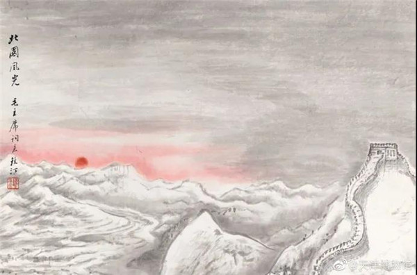 此图作于1909年,自题仿李成笔法。用“留白法”描绘雪景,村屋、篱笆院等用赭石渲染,人物红色的衣衫以及红色树叶的点缀更是点睛之笔,给白雪皑皑的画面增添了一抹亮丽的色彩。