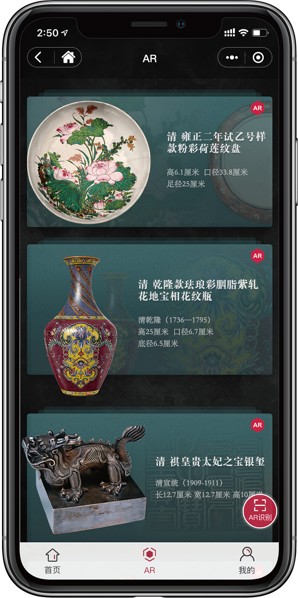 三、AR功能:博物馆有AR效果的展品列表,点击可查看展品的AR,通过扫一扫按钮,可直接扫描展品获取AR详情。