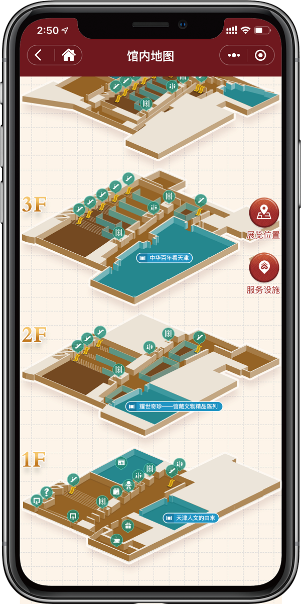 五、馆内地图:绘制博物馆1至5层2.5D地图并标注各个展厅的位置,直梯、厕所、母婴室等服务设施。直接点击展厅名称图标可进入该展厅的平面地图,点击展品头像可听语音讲解。