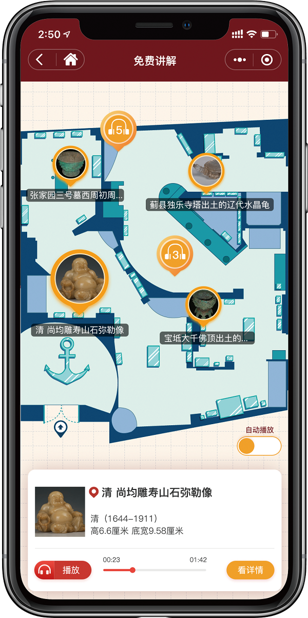 一、自动讲解:当观众进入展厅以后,进入展厅地图页面开启自动讲解模式;观众靠近展品还可以触发地图导览模式。