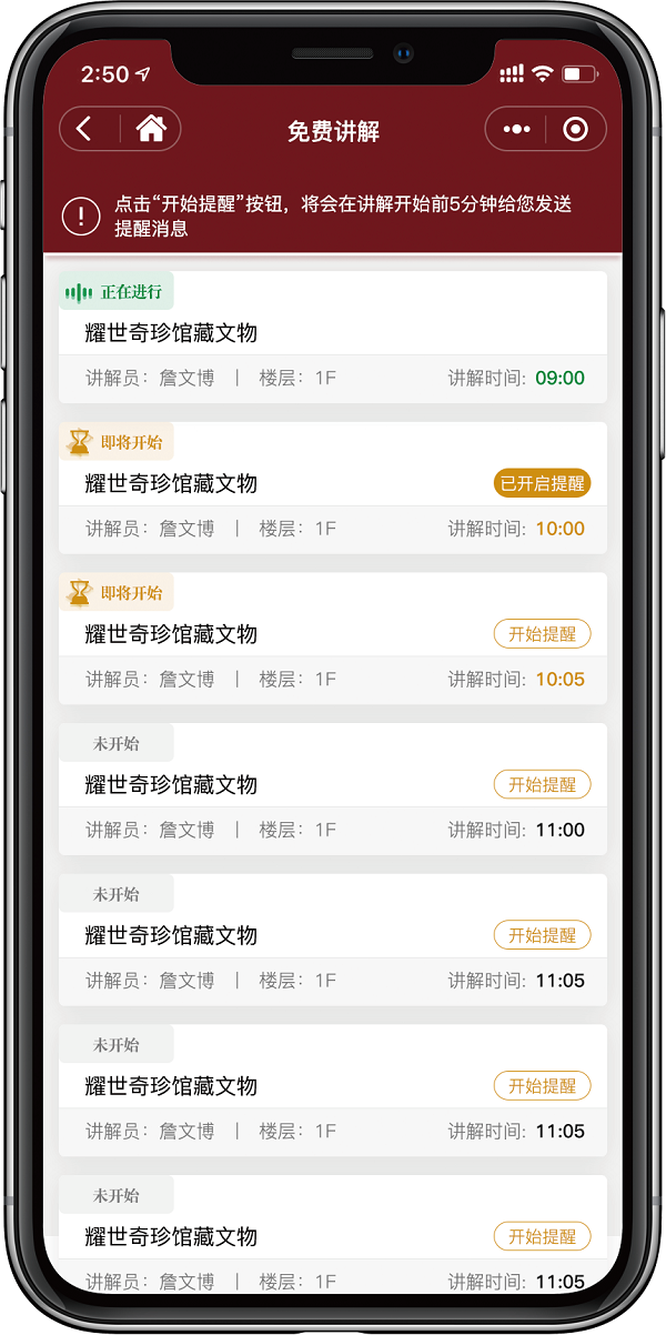 四、讲解预告:设置免费讲解消息提醒后,提前5-10分种会提醒观众尽快参加免费讲解。