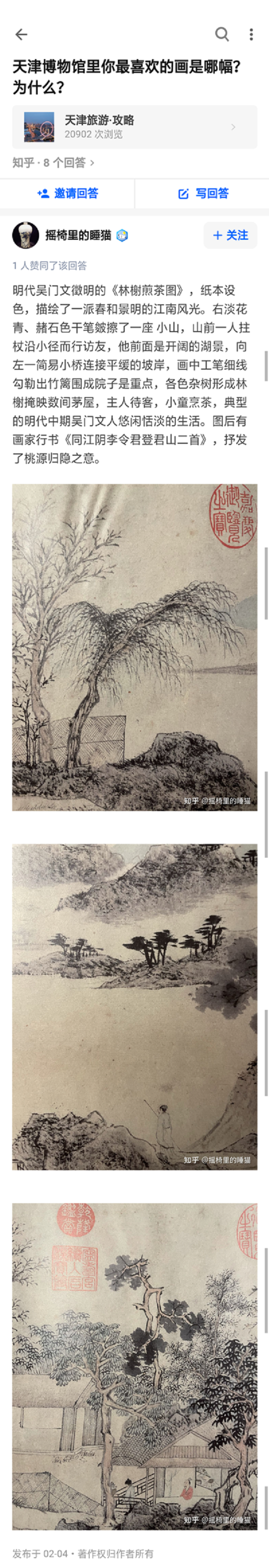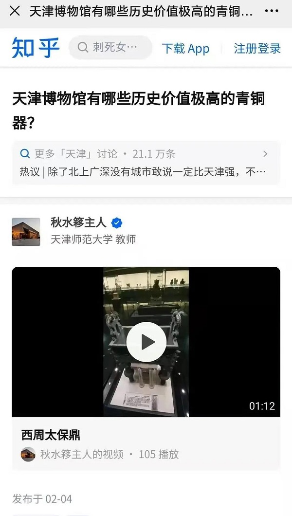 近日,天津博物馆志愿者团队与知乎天津合作举办了“志愿答题云服务”活动。天博志愿者们充分发挥自身文博知识特长,在知乎平台为网友解答天津地方文化、旅游方面的相关问题。志愿者们通过文字、图片、小视频等多种形式, 以“云服务”的方式进行线上文化志愿服务,让更多的人能够通过网络平台 云游天津、了解天津、认识天津,感受天津文化底蕴。