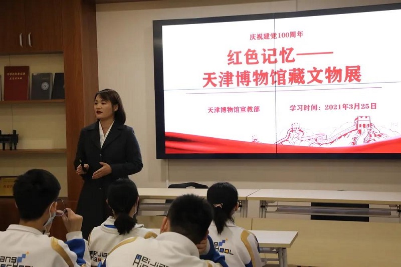 3月25日,天津博物馆社教专员走进梅江中学,结合建党百年主题,为高一、高二年级师生带去了一堂意义非凡的党史教育课。