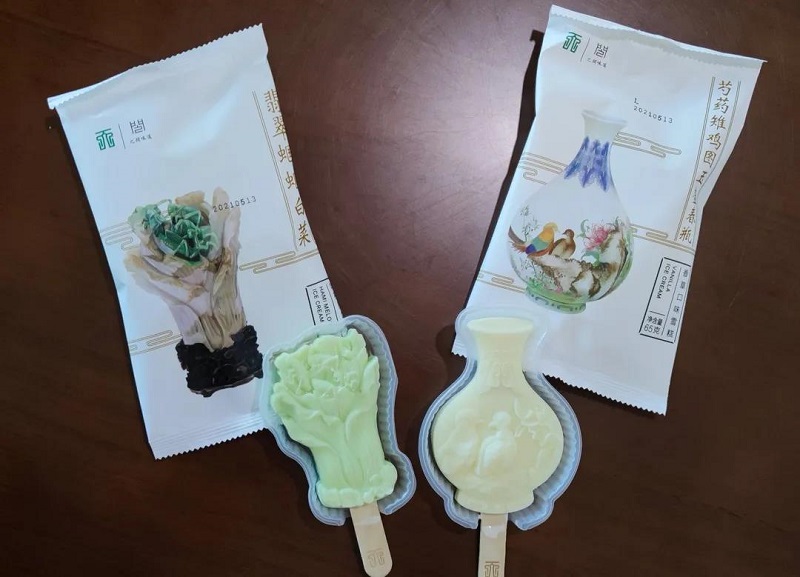 此次推出的同款雪糕,在糕体元素保留了瓷器上一对雌雄雏鸡栖息于山石上的形象,盛开的芍药绽放在一旁,精雕细刻、线条流畅,高度还原了玉壶春瓶本身的样子。而由纯牛奶特调的香草口味,更是从口感和色泽两方面,满足了人们对雪糕的期待!