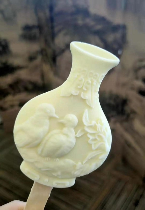 乾隆款珐琅彩芍药雉鸡图玉壶春瓶,作为天博的‘镇馆之宝’,是天博的‘流量当担’,其造型古朴,纹饰精美,色彩艳丽雅致,是诗、书、画合璧的彩瓷艺术珍品,满满彰显着乾隆爷的审美。此次推出的同款雪糕,在糕体元素保留了瓷器上一对雌雄雏鸡栖息于山石上的形象,盛开的芍药绽放在一旁,精雕细刻、线条流畅,高度还原了玉壶春瓶本身的样子。而由纯牛奶特调的香草口味,更是从口感和色泽两方面,满足了人们对雪糕的期待!