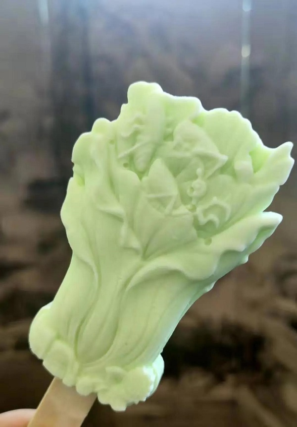 翡翠蝈蝈白菜雪糕,以文物为原型开发而成,白菜与蝈蝈鲜活灵动,蝈蝈好像在边爬边啃菜叶,栩栩如生。哈密瓜口味的雪糕自带清香气息,绿色的糕体使翡翠蝈蝈白菜雪糕愈发显得充满生机与活力。