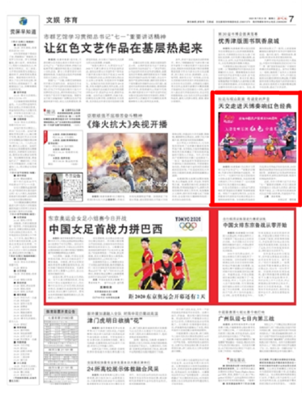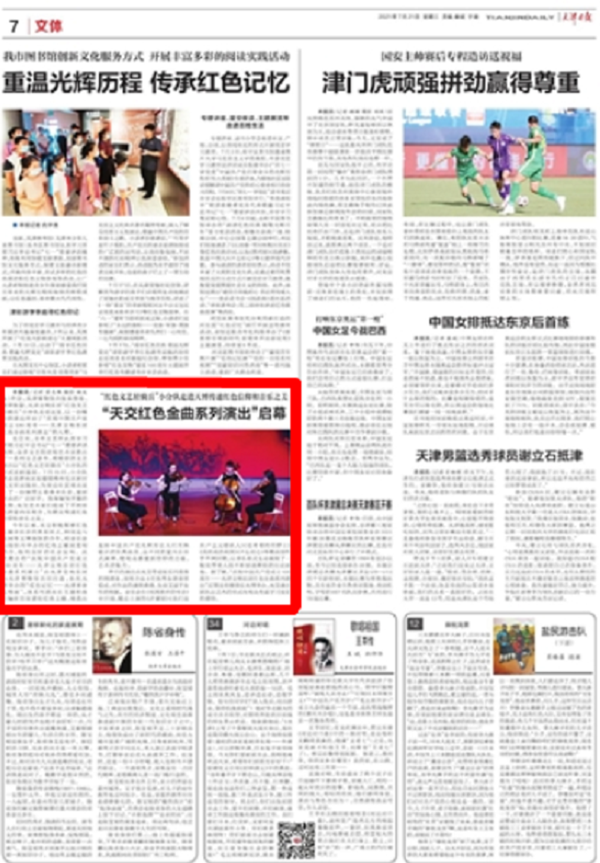 为庆祝中国共产党成立100周年,由市委宣传部和市文化和旅游局主办,中共天津市委党校、天津市档案馆协办,天津博物馆承办的 《红色记忆——天津革命文物展》在天津博物馆展出。为创新我市党员干部学党史上党课的新载体,天津博物馆与天津交响乐团联合主办了《天津交响乐团红色金曲系列演出》活动。