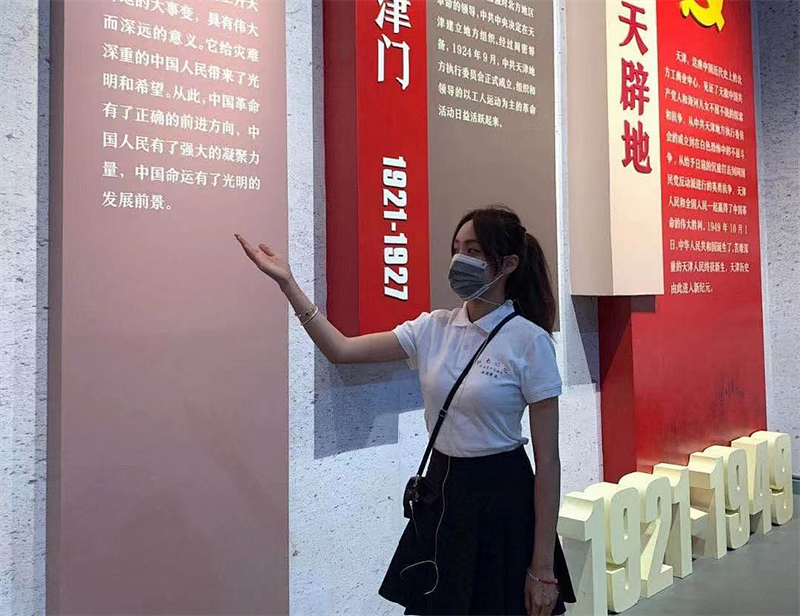 “这是天津市全体工商界青年献给中共天津市委的锦旗。“永远听毛主席的话,跟共产党走!”简单朴素的话语,是人们对党发自内心的热爱和感激。”每当讲到此时,67岁的志愿讲解员刘爱军都会满怀激情,48年党龄,连续3年的市级劳动模范,作为这支团队中“50后”的代表,她说:“我生在新中国,长在红旗下”, 能在党的百年华诞,讲党史、传承革命精神是我作为老党员、志愿者的光荣。为了能讲好展览,她从多年积攒的报纸中寻找资料,编辑出五本剪报,用自己的方式,熟悉文物积累素材,并为年轻的志愿者们提供详实的讲解内容。去年年末她的丈夫突发脑梗,4岁的孙女也需要照顾,面对家庭困难她依然保证出勤,以自己的实际行动践行一名老党员的初心与使命。