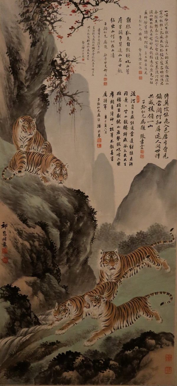 此图由吴隚画虎,祁崑补景。题识四人均为晚清进士,且都曾任职翰林院,为当时风尚。虎与福谐音,绘五虎,常有五福临门之寓意。上款人“子龄”,当为商人侯子龄,曾任天津泰兴银号董事长。