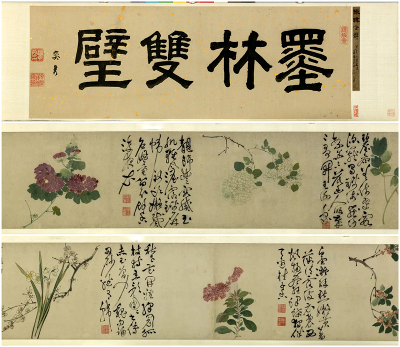 本卷由陈栝用小写意画法绘玉兰、牡丹、绣球、芙蓉、蜀葵、桂花、鸡冠花、水仙、梅花等花卉九种共八段。每段后有韩世能题诗一首,相得益彰。陈栝传其家法,花朵的表现手法既有墨笔勾勒淡设色,也有重色没骨点染,用笔疏放适度,洒脱自如,格调潇洒隽朗。此图经《潘氏三松堂书画记》著录。