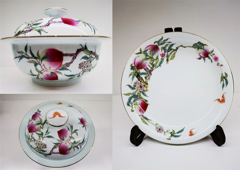 以天津博物馆馆藏文物清雍正款粉彩五福八桃过枝纹盘为设计元素,将“蝙蝠”“桃子”提取出来融入到现代瓷器中,红色的蝙蝠寓意“福气”,桃子寓意“长寿”,蝠桃组合纹饰寓意“福寿双全”,与桃枝上嫩绿的叶子,粉红、月白的花朵相映衬,浓淡相宜,彰显别具一格的艺术气息。
