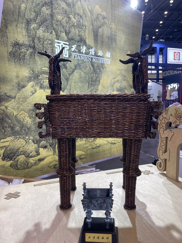 当博物馆人关注乡村振兴,很自然地关注到民族手工艺失传的问题。眼下,传统工艺失传与妇儿老弱留守农村是当前很常见的两大社会问题所在。如何将其更好地结合在一起呢?在天津博物馆党委的支持下,驻村工作队积极对接镇村,结合地域特色,与当地妇女职业技能培训组织和技能大赛等活动进行联系,天津博物馆副馆长、李叔同故居纪念馆馆长沈岩,天津博物馆文创部主任魏鹤赴杨津庄镇实地开展文创产品开发调研活动……经过前期一系列的行动,在坚持“最大限度尊重文物,又兼具实用价值”的原则基础上,成功推出了杞柳编织文物造型、编织轻便耐用的箱包、DIY手工艺品等产品,并赶在“博博会”开幕前制作完成,由此才有了文章开头,柳编太保鼎精彩亮相郑州“博博会”那一幕。
