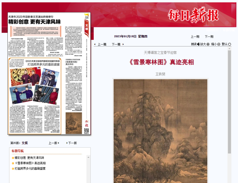 每日新报 |  1月19日,每日新报第5版刊载文章《天博镇馆之宝春节迎客,<雪景寒林图>真迹亮相》。
