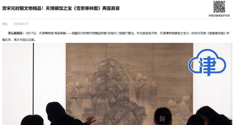 央视新闻客户端 | 1月18日,央视新闻客户端刊发《天津博物馆宋元精品文物展开展,<雪景寒林图>真迹展出》,文章发布一经发布,浏览量迅速达到175300余次。