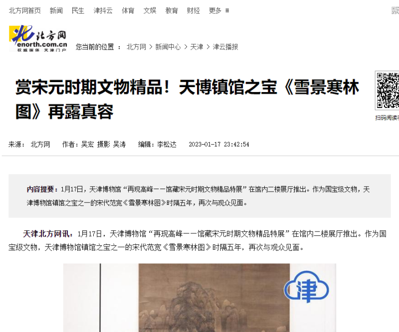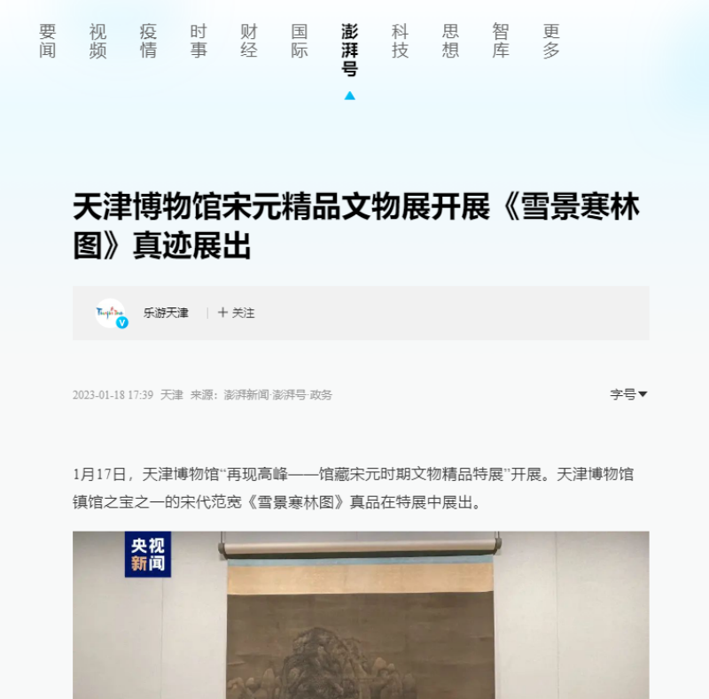 澎湃新闻 | 1月18日,澎湃新闻发布《天津博物馆宋元精品文物展开展<雪景寒林图>真迹展出》。