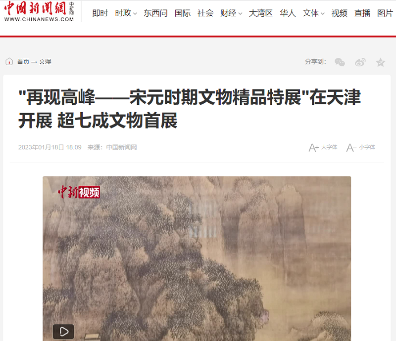 中新社 | 1月18日,中新社发布天津博物馆“再现高峰——宋元时期文物精品特展”开展视频。中国新闻网发布文章《“再现高峰——宋元时期文物精品特展”在天津开展 超七成文物首展》。