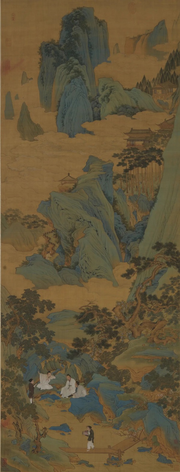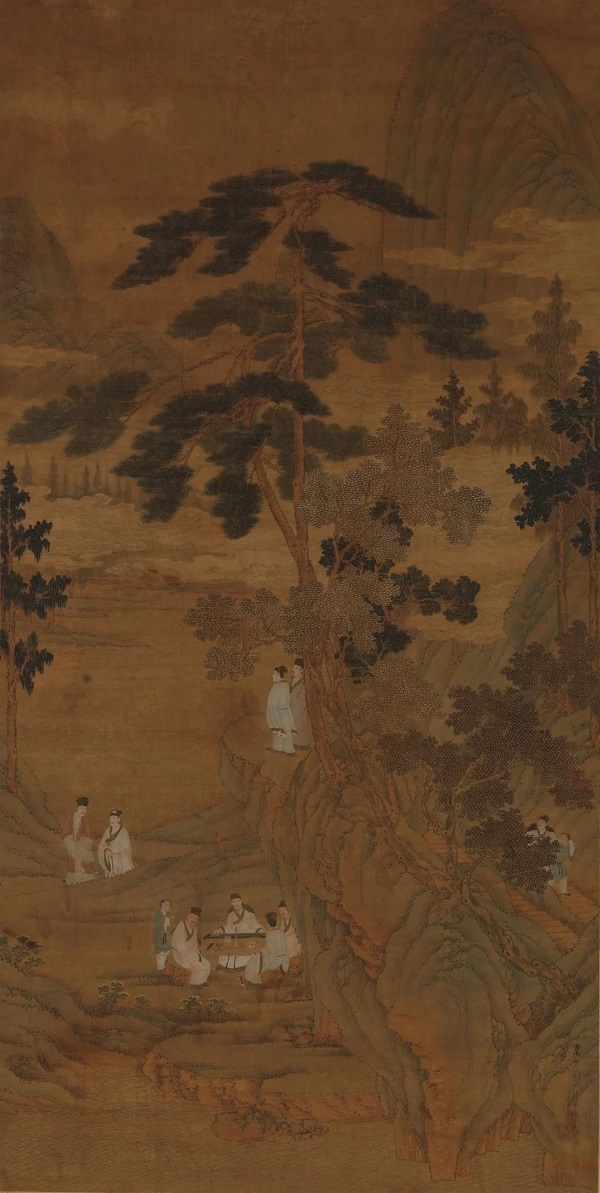 《桃源仙境图》描绘了怡然自乐的理想境地,峯岫层起叠涌,山间云雾缭绕,松木高大挺拔,山下溪泉潺潺。板桥曲径处,三位白衣布士席地而坐,或弹琴赏乐,或倾心长谈,或手舞足蹈。全画笔致工细,色彩明亮,彰显了仇英精湛的山水和人物表现能力。