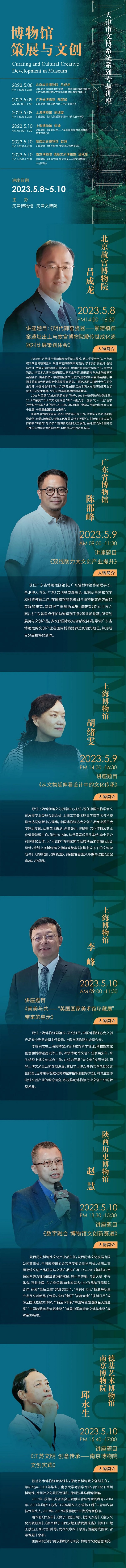 为深入开展学习贯彻习近平新时代中国特色社会主义思想主题教育,提高全市文物博物馆系统工作人员的专业水平,着力推动博物馆事业高质量发展,天津博物馆、天津文博院将于2023年5月8日—5月10日在天津博物馆一楼报告厅举办“博物馆策展与文创”系列专题讲座。届时,将邀请全国文博界知名专家、学者来津为全市文博界专技人员授课。天津市文博系统工作人员均可凭会议通知(纸质版或电子版)参加。