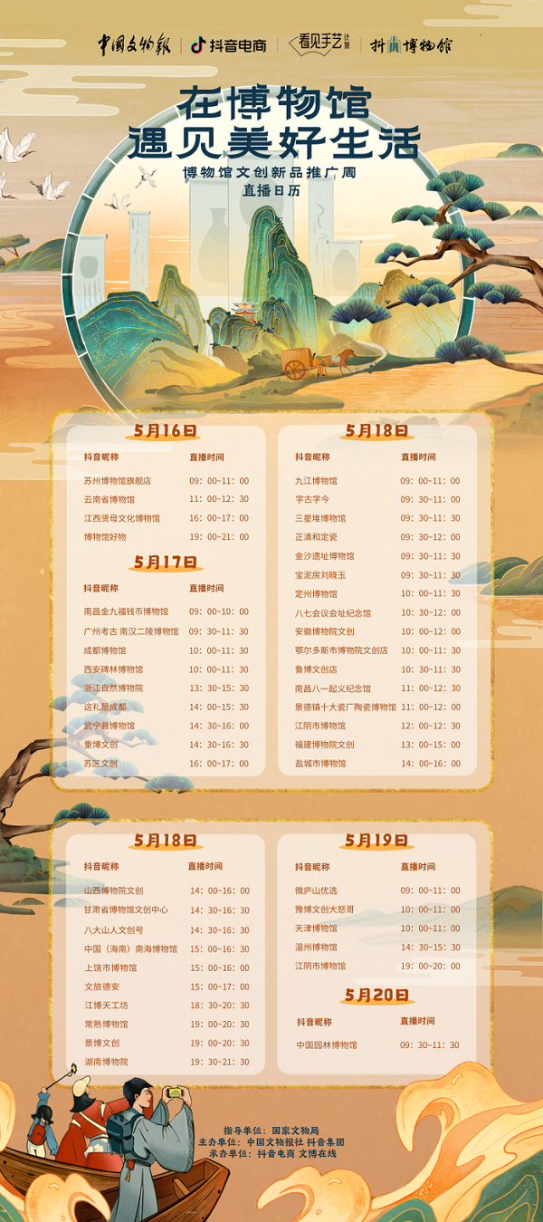 在2023年“5·18国际博物馆日”到来之际,“在博物馆遇见美好生活·博物馆文创新品推广周”活动在抖音平台上线。该活动由国家文物局指导,中国文物报社、抖音集团主办,抖音电商、文博在线承办,邀请全国62家博物馆带来千款文创产品,通过短视频、博物馆自播、达人带货等内容形式,生动直观讲述博物馆历史故事、文物故事和文创特色,助力知识传播与文创推广。