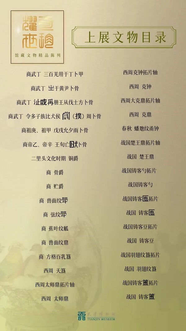 为扎实开展学习贯彻习近平新时代中国特色社会主义思想主题教育,不断满足广大人民群众对高品质精神文化生活的需求,贯彻落实高质量发展“十项行动”,更好地服务广大观众,特公布“耀世奇珍——馆藏文物精品陈列”展品目录。此次全新升级的展览,精准对接观众需求,充分发掘馆藏文物,阐释好文物背后的中华优秀文化内涵。展览精选天津博物馆甲骨、青铜器、玉器、书画、陶瓷器、竹木牙角器、砚台、墨、玺印等各类文物精品百余件,呈现天津博物馆琳琅满目、精品纷呈的丰富馆藏。展品几乎全部为一二级品,其中一级品更是占了绝大多数。全新升级的“耀世奇珍”中囊括的文物种类更多,展出的文物数量更多,更是将近百分之五十的展品为新鲜上展,此前未在精品陈列中进行展示。这些是文物工作者在文物活起来的原则下深入挖掘馆藏资源,经过精心的准备、论证,又挑选出的一批珍贵文物资源。此次展览筹备中着重增加与中华文明起源相关、与大运河相关,以及反映天津历史文化传承的重点文物,让观众在全面了解馆藏的同时,借助文物对中华文明起源、对历史文化传承加深了解。展览注重文物整合,通过小专题讲述文物故事,例如天津博物馆收藏了与奕劻有关的三套金册,以及清和硕庆亲王宝鎏金银印,这些文物自成系列,整体反映了清末至民国初年的爵位承袭制度,有较高历史价值,极为难得,在展览中进行了集中展示。另外此次展览在展示文物实物的基础上,首次展出西周太师鼎、西周克钟、西周大克鼎、战国楚王鼎等拓片,这些新挖掘出来的拓片既是珍贵馆藏,也是文物的重要研究资料。