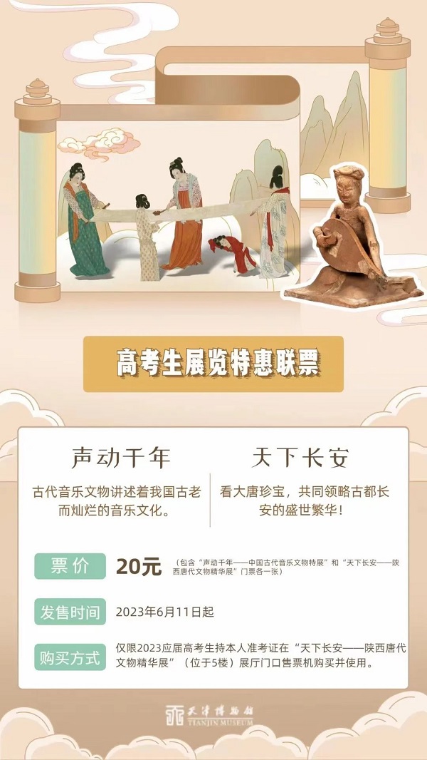 票价:20元(包含“声动千年——中国古代音乐文物特展”和“天下长安——陕西唐代文物精华展”门票各一张)