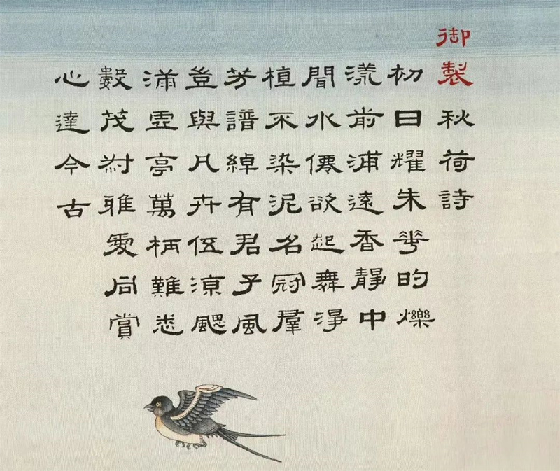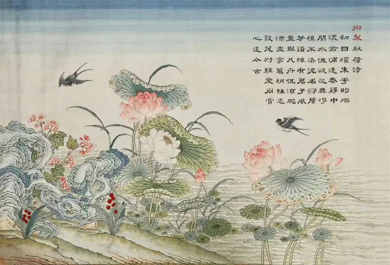 此件作品以缂丝工艺制成,做工精细,色彩清丽,画面生机盎然。作品描绘一处水边的秋日景色,岸上有山石花草,荡着微波的水边植几株荷花,叶边微枯黄,花叶相互掩映,摇曳生姿,荷花上方有两只燕子盘旋欲落,画面上部以渐变的蓝色表现碧空千里。右上角题“御制秋荷诗”,题诗内容为:初日耀朱花,昀烁漾前浦。远香静中闻,水仙欲起舞。净植不染泥,名冠群芳谱。绰有君子风,岂与凡卉伍。凉风满虚亭,万柄难悉数。茂叔雅爱同,赏心达今古。